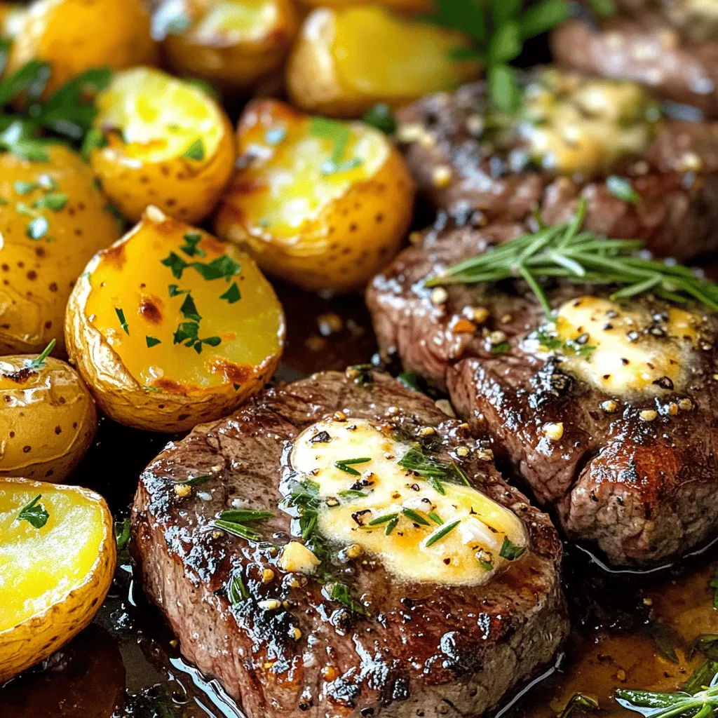 To make Sheet Pan Garlic Butter Steak Bites & Potatoes, gather these key items: - 1 pound sirloin steak, cut into bite-sized pieces - 1 pound baby potatoes, halved - 4 tablespoons unsalted butter, melted - 4 cloves garlic, minced - 2 teaspoons fresh rosemary, chopped (or 1 teaspoon dried) - 2 teaspoons fresh thyme (or 1 teaspoon dried) - Salt and pepper to taste - 1 tablespoon olive oil - Optional: Fresh parsley, for garnish These ingredients work together to create a tasty, garlic-infused dish. The sirloin steak provides rich flavor, while the baby potatoes add heartiness. If you need substitutes, here are some options: - Use flank steak instead of sirloin for a different texture. - Swap baby potatoes for Yukon gold or red potatoes. - For a dairy-free version, replace unsalted butter with olive oil or plant-based butter. - Fresh herbs like parsley or oregano can stand in for rosemary and thyme. These alternatives keep the dish delicious while allowing room for personal taste. Want to elevate the dish? Consider these gourmet touches: - Add a splash of Worcestershire sauce for depth of flavor. - Toss in some cherry tomatoes or bell peppers for extra veggies. - Sprinkle crumbled blue cheese or feta over the finished dish for richness. - Try adding a squeeze of lemon juice before serving for a bright finish. These gourmet additions can take your meal from simple to stunning, making it a hit for any occasion. First, set your oven to 425°F (220°C). This high heat helps cook the steak bites and potatoes evenly. While the oven heats, get your ingredients ready. You will need one pound of baby potatoes and one pound of sirloin steak. Cut the steak into bite-sized pieces. Halve the baby potatoes for quick cooking. In a large bowl, mix the halved potatoes with one tablespoon of olive oil, salt, and pepper. Add one teaspoon of rosemary for extra flavor. Toss the potatoes well until they are coated. Spread the seasoned potatoes on a large sheet pan in a single layer. Put the pan in the oven and roast for 20-25 minutes. Stir them halfway through cooking. They should be soft and golden when done. While the potatoes roast, it's time to prepare the steak bites. In a separate bowl, combine the bite-sized steak pieces with four tablespoons of melted butter. Add four minced garlic cloves, two teaspoons of thyme, and the remaining rosemary. Season with salt and pepper. Mix everything well until the steak is fully coated. Once the potatoes are halfway cooked, carefully take the sheet pan out of the oven. Push the potatoes to one side of the pan. Spread the prepared steak bites on the other side. Return the pan to the oven. Roast for an additional 10-12 minutes. This will cook the steak to your desired doneness and make the potatoes crispy. After cooking, let the dish rest for a couple of minutes. Optionally, sprinkle fresh parsley on top for a nice touch before serving. To get the best steak bites, choose sirloin. It has great flavor and tenderness. Cut the steak into even pieces so they cook at the same rate. Make sure to season them well with salt and pepper. The butter and garlic mix adds flavor, but let the steak rest after cooking. It helps keep the juices inside. Seasoning is key for great taste. Use fresh herbs like rosemary and thyme. They add a nice aroma and depth to the dish. Mix the herbs with melted butter and minced garlic. This blend coats the steak bites and makes them delicious. Don’t be shy with the salt and pepper! They enhance all the flavors. For crispy potatoes, halving them helps. Smaller pieces cook faster and crisp better. Use a high oven temp of 425°F (220°C) to roast them. Toss the potatoes in olive oil and seasonings before roasting. Make sure they are in a single layer on the sheet pan. Stir them halfway through cooking for even crispiness. {{image_2}} For this recipe, I often use sirloin steak. It’s tender and flavorful. However, you can try other cuts, like ribeye or flank steak. Ribeye gives a rich taste, while flank steak is leaner. Just remember to adjust cooking time based on the cut. Thicker pieces may need more time, while smaller bits cook faster. Potatoes are great, but you can mix in other vegetables. Carrots, bell peppers, or zucchini work well. Chop them into similar sizes for even cooking. This mix adds color and nutrition to your dish. It also lets you use what you have on hand. Just remember, denser veggies like carrots may need extra time to cook. Herbs and spices can change the whole dish. If you want a fresh twist, add basil or cilantro. For a spicy kick, try red pepper flakes or paprika. You can also use garlic powder for a stronger garlic taste. Experimenting with these options can lead to fun and new flavors. Always taste as you go to find your best mix. To keep your Garlic Butter Steak Bites and Potatoes fresh, store them in an airtight container. Let the dish cool to room temperature first. Place it in the fridge for up to three days. This method keeps the flavors intact and the food safe to eat. Reheat your leftovers in the oven for the best taste. Preheat the oven to 350°F (175°C). Spread the steak bites and potatoes on a baking sheet. Heat them for about 10-15 minutes, or until warmed through. You can also use a microwave, but the oven keeps the potatoes crispy. If you want to freeze your meal, do so within two days. Use a freezer-safe container or bag. It can last up to three months in the freezer. To reheat, thaw overnight in the fridge. Then, follow the reheating instructions for the oven. This way, you can enjoy this dish again later! The best steak for this recipe is sirloin. It is tender and flavorful. Sirloin cooks well at high heat, making it perfect for quick meals. You can also use ribeye for extra richness. If you prefer leaner meat, flank steak works too. Choose a cut that you enjoy. Yes, you can use a different type of pan. A cast iron skillet or baking dish can work well. Just make sure it has enough space for the steak and potat
