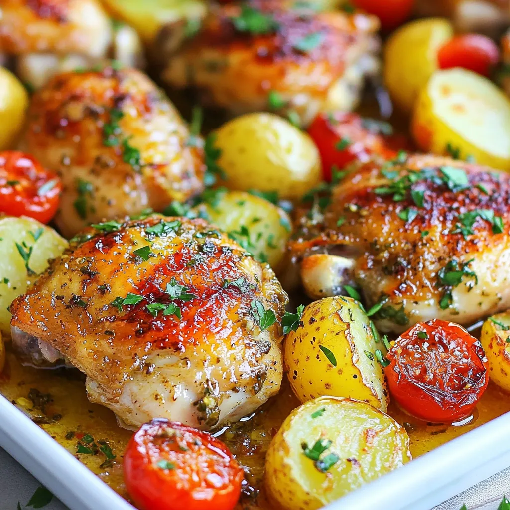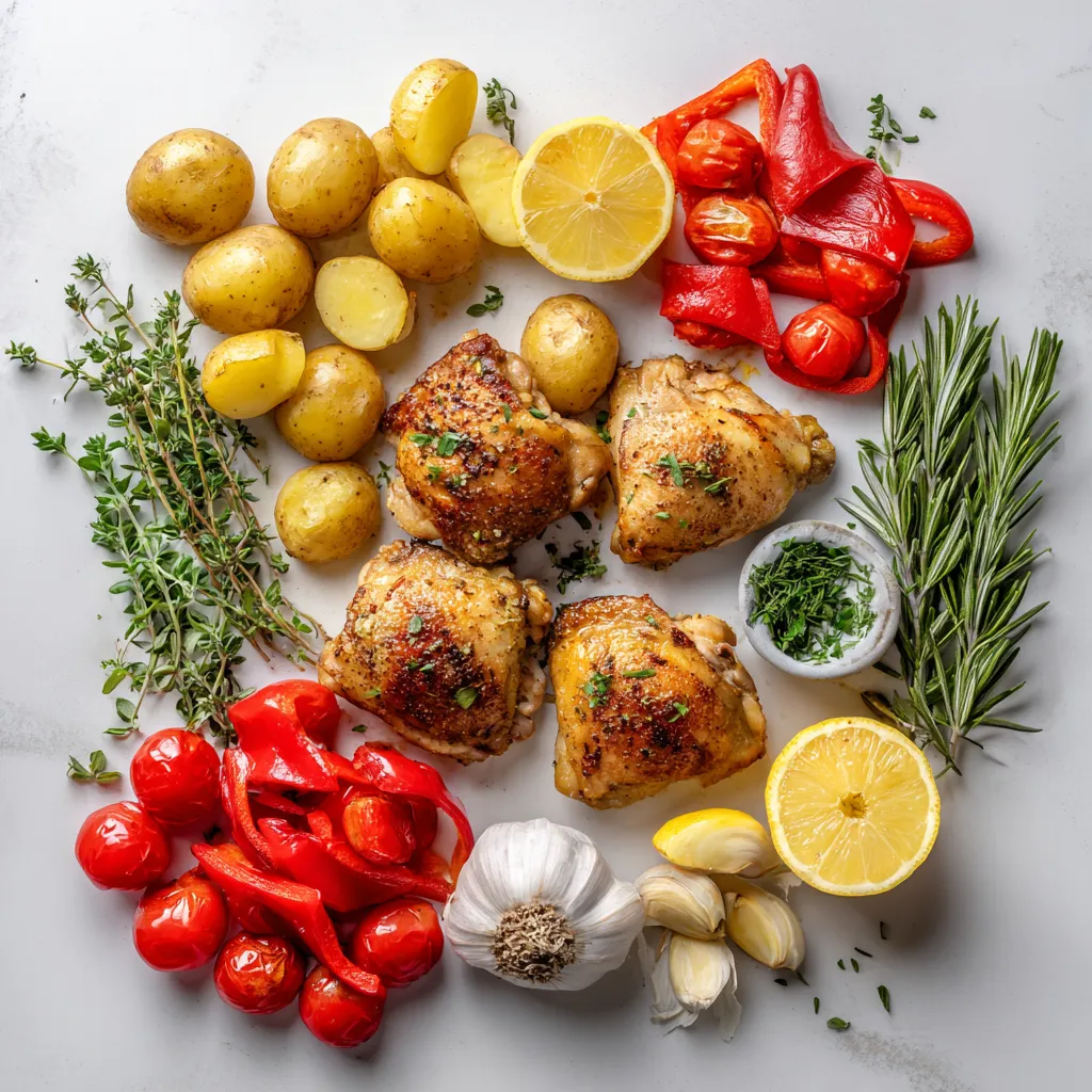 A delicious and easy one-pan meal featuring chicken thighs, baby potatoes, and colorful vegetables, all infused with lemon and herbs.