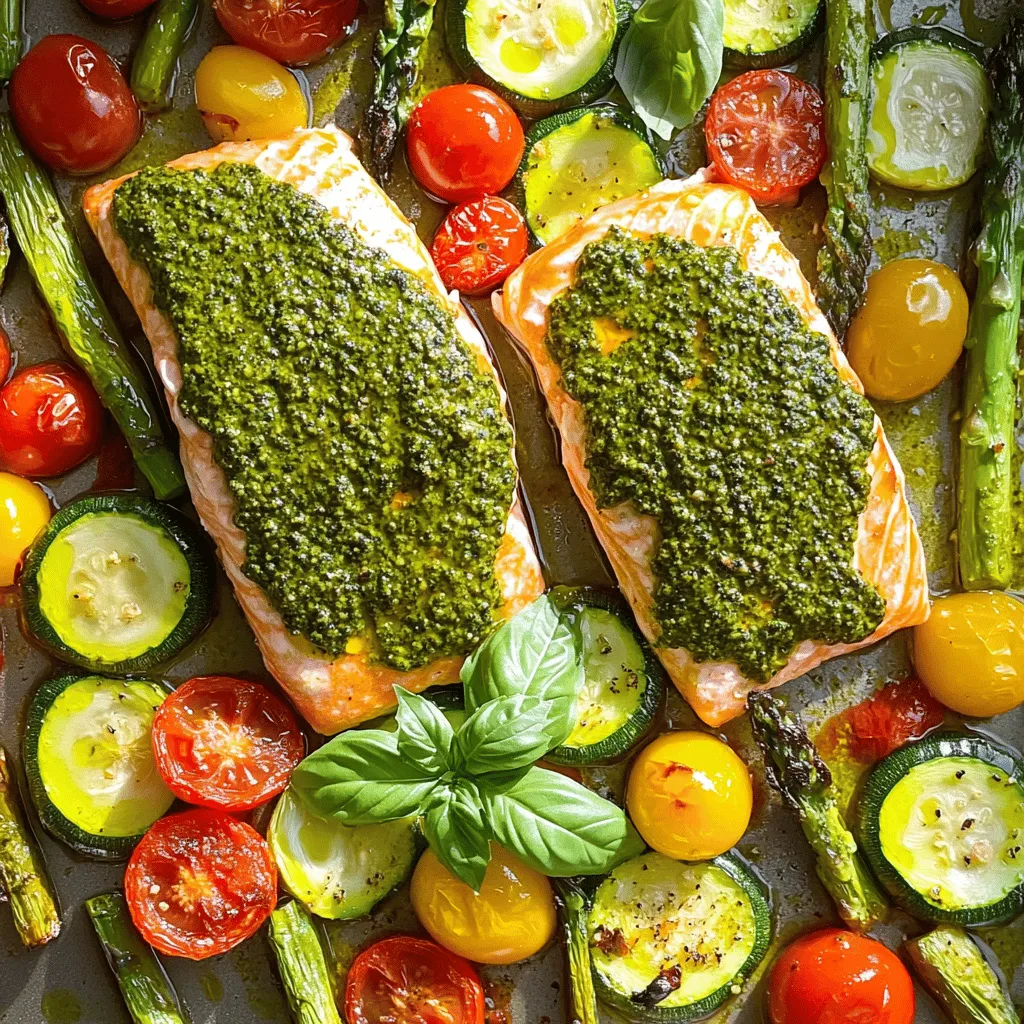 This dish features fresh salmon and colorful veggies. The salmon fillets offer rich flavor and healthy fats. Basil pesto adds a bright, herby touch that elevates the meal. Assorted vegetables not only make it appealing but also pack in nutrients.