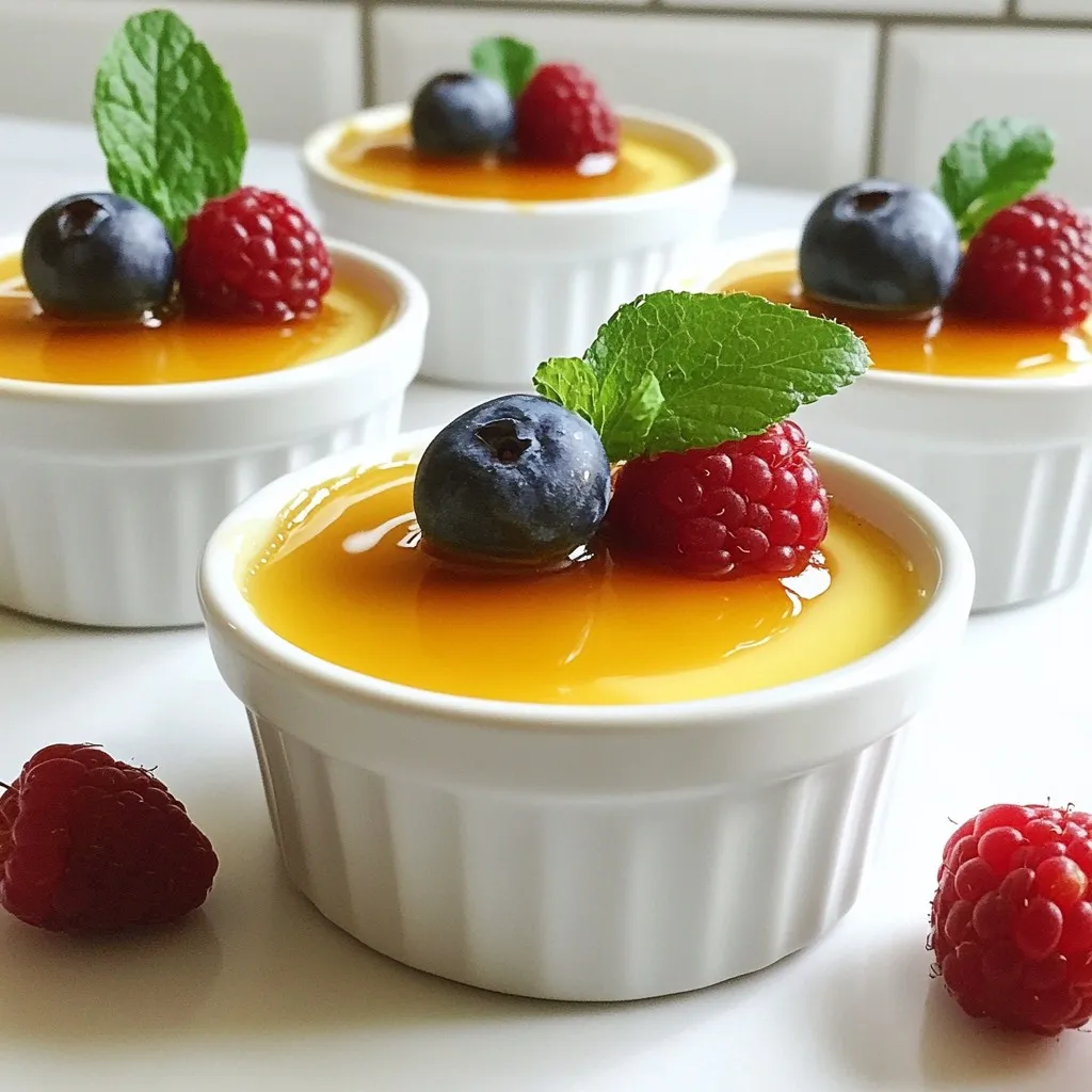 These ingredients combine to create a delicious custard. The eggs give it a rich texture. The sugar adds sweetness, while the milk makes it creamy. The vanilla brings warmth and flavor. Cornstarch helps to thicken the custard, ensuring it holds its shape. A little salt balances the sweetness. Caramel sauce adds a sweet finish, and berries make a bright garnish.