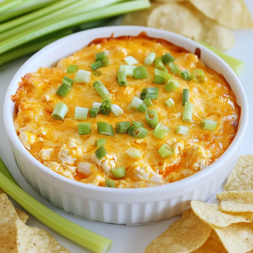 To make a tasty Slow Cooker Buffalo Chicken Dip, you need these simple ingredients: - 2 cups shredded cooked chicken (rotisserie chicken works well) - 1 package (8 oz) cream cheese, softened - 1 cup buffalo sauce (adjust for desired heat level) - 1 cup shredded sharp cheddar cheese - 1/2 cup ranch dressing or blue cheese dressing - 1/4 cup green onions, chopped (for garnish) - Tortilla chips or celery sticks for serving These ingredients blend together for a creamy and spicy dip. The chicken adds protein, while the cream cheese gives it a rich base. Buffalo sauce brings the heat, and cheddar cheese makes it ooey-gooey. The ranch or blue cheese dressing adds a tangy touch. Green onions on top give a fresh crunch. You can serve this dip with tortilla chips or crunchy celery sticks. Both options complement the flavors well. Enjoy this dip at parties or game days; it will surely please your guests! {{ingredient_image_1}} First, gather your ingredients. In a slow cooker, add the softened cream cheese. Then, mix in the shredded chicken. Next, pour in the buffalo sauce and ranch or blue cheese dressing. Stir well until everything combines smoothly. The cream cheese should blend nicely with the other ingredients. Now, cover your slow cooker. Set it to low and cook for 2 to 3 hours. You want the dip to be hot and bubbly. After the cooking time is up, stir the mixture again. This helps keep the dip creamy. Next, add the shredded cheddar cheese on top. Allow it to melt for about 15 to 20 minutes. This gives the dip a rich, cheesy flavor. Once the cheese is melted, take the dip out of the slow cooker. Stir it to ensure a smooth texture. Before serving, garnish with chopped green onions. This adds a nice color and fresh taste. Serve the dip warm in a decorative bowl. Surround it with tortilla chips and celery sticks for dipping. Enjoy the tasty Buffalo chicken dip at your next party! For a smooth dip, mix the cream cheese well. I find it helps to soften it first. Use a whisk or a spatula to break it down. This way, it blends better with the chicken and sauces. When melting the cheese, add it last. I recommend waiting until the dip is hot. Let the cheddar sit on top for about 15 to 20 minutes. This ensures it melts nicely and blends into the dip. To change the spice level, adjust the buffalo sauce. If you want more heat, add more sauce. For less heat, use less sauce or a milder brand. You can also mix in some honey for sweetness. If you want a different taste, try alternative dressings. You can swap ranch for blue cheese dressing or even Caesar dressing. Each option gives a unique flavor. Pro Tips Use Quality Chicken: For the best flavor, use rotisserie chicken or leftover grilled chicken. The seasoning from the chicken adds depth to the dip. Adjust the Heat: If you're sensitive to spice, start with a milder buffalo sauce and gradually increase the amount to suit your taste. Serve Immediately: This dip is best enjoyed fresh and warm. If you need to make it ahead of time, reheat gently on low in the slow cooker before serving. Add Extra Flavor: Consider mixing in some crumbled blue cheese or additional spices like garlic powder and smoked paprika for an extra kick. {{image_2}} If you want a vegetarian dip, you can swap chicken for chopped cauliflower or mushrooms. Both options add great texture. You can also use canned chickpeas for extra protein and fiber. For cheese, swap the sharp cheddar for pepper jack for a spicy twist. You can also try mozzarella for a milder flavor. Cream cheese is key for creaminess, but Neufchâtel works well too. Adding ranch seasoning boosts the dip's flavor. Just a teaspoon or two will make it extra tasty. You can also try garlic powder or onion powder for more depth. For herbs, add fresh cilantro or parsley. They brighten the dish and give it a fresh taste. A dash of smoked paprika adds a nice smoky flavor too. These changes can make your buffalo chicken dip unique and fun for any party! To keep your buffalo chicken dip fresh, first let it cool down. Then, transfer it to an airtight container. Use a container that seals well to keep out air. This helps the dip stay tasty. Store it in the fridge for up to three days. If you need to store it longer, consider freezing it. For freezing, use a freezer-safe container. Make sure to leave some space for expansion as it freezes. When you're ready to enjoy leftovers, reheating is key. You can use a microwave or stovetop. For the microwave, place the dip in a safe bowl. Heat it in short bursts of 30 seconds. Stir after each burst until heated through. For the stovetop, use a small pot over low heat. Stir often to prevent sticking. For serving, consider adding fresh toppings. A sprinkle of green onions or extra cheese can revive the dip. Serve it warm with fresh tortilla chips or celery sticks for dipping. This makes it feel fresh and fun again! Yes, you can make this dip ahead of time. Prepare it and store it in the fridge. Just reheat it in the slow cooker before serving. This saves time on party day. You can serve buffalo chicken dip with tortilla chips or celery sticks. Both options add great crunch. You might also try crackers or sliced veggies for more variety. Leftovers can last for about 3 to 4 days in the fridge. Store them in an airtight container to keep them fresh. To enjoy them later, just reheat in the microwave or slow cooker. Yes, you can freeze buffalo chicken dip. Place it in a freezer-safe container. It will last for about 2 to 3 months. To eat, thaw it in the fridge overnight, then reheat it. This blog post covered how to make delicious buffalo chicken dip. We discussed the essential ingredients and detailed steps to prepare it. You learned tips for a creamy texture and ways to adjust the heat level. Variations, substitutions, and storage information were also shared to enhance your experience. In conclusion, making this dip is simple and fun. You can experiment with flavors and serve it with your favorite snacks.