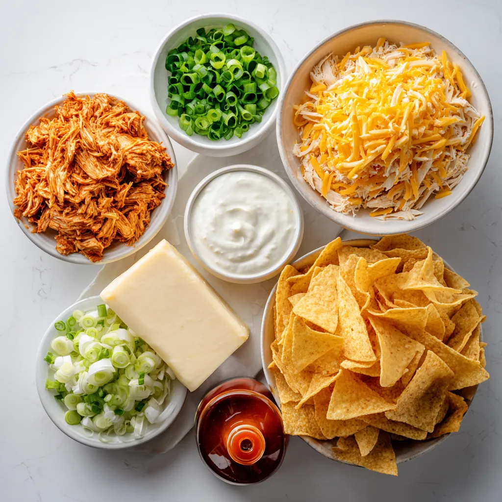 These ingredients blend together for a creamy and spicy dip. The chicken adds protein, while the cream cheese gives it a rich base. Buffalo sauce brings the heat, and cheddar cheese makes it ooey-gooey. The ranch or blue cheese dressing adds a tangy touch. Green onions on top give a fresh crunch.