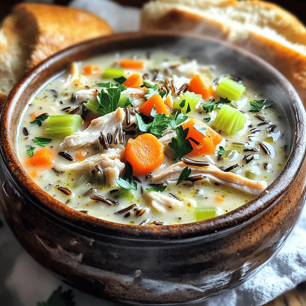 - 1 lb boneless, skinless chicken breasts - 1 cup wild rice, rinsed - 4 cups chicken broth - 1 cup diced carrots - 1 cup diced celery - 1 cup chopped onion - 2 cloves minced garlic - 1 teaspoon dried thyme - 1 teaspoon dried rosemary - 1 bay leaf - Salt and pepper to taste - 1 cup heavy cream or coconut cream - 2 tablespoons olive oil - Fresh parsley for garnish The main ingredients in this soup make it hearty and filling. The chicken breasts provide protein, while wild rice adds a nice texture. The chicken broth gives a rich flavor that ties everything together. For the vegetables, I like using fresh carrots, celery, and onions. They bring sweetness and crunch. Garlic adds depth and warmth to the soup. The thyme and rosemary bring an earthy aroma that lifts the dish. A bay leaf adds a subtle layer of flavor. For creaminess, you can use either heavy cream or coconut cream. The latter is great for a lighter option. The olive oil adds richness, and fresh parsley gives a pop of color. It also adds a fresh taste as a garnish. Having these ingredients ready makes cooking easier and more fun. Each bite of this soup warms your soul, making it a perfect comfort food. Start by seasoning the chicken breasts with salt and pepper. This simple step boosts flavor. Place the seasoned chicken at the bottom of the slow cooker. This lets the juices soak into the meat as it cooks. Next, you’ll add the veggies. Pour in one cup of diced carrots, one cup of diced celery, and one cup of chopped onion. These add color and nutrition. Don’t forget to add two cloves of minced garlic. Finally, sprinkle in one cup of rinsed wild rice. This rice will give the soup its hearty texture. Now, pour in four cups of chicken broth. This broth forms the soup’s base, so choose a good quality one. Add one teaspoon of dried thyme, one teaspoon of dried rosemary, and one bay leaf. Stir gently to mix all the flavors together. Cover the slow cooker and set it to low for 6-8 hours. If you’re short on time, you can set it to high for 4-5 hours. The goal is to cook until the chicken is tender and the rice is fully cooked. Once the cooking is done, remove the chicken breasts. Use two forks to shred the chicken into bite-sized pieces. Return the shredded chicken to the pot. Then, stir in one cup of heavy cream. This adds a rich, creamy texture. Let the soup warm on low for an extra 15 minutes. Before serving, taste the soup. Adjust seasoning with salt and pepper as needed. Don’t forget to remove the bay leaf! To make this soup taste great, start with salt and pepper. I suggest adding a little salt first, then tasting. You can always add more later. For pepper, add a pinch and adjust to your liking. Fresh herbs can really boost the flavor. Try adding some fresh thyme or rosemary if you have them. This will make your soup even more aromatic and tasty. If you want a lighter soup, you can swap heavy cream for coconut cream. Coconut cream gives a nice flavor without the fat. You can also use milk or a non-dairy milk like almond or soy milk. Just add it slowly at the end to get the right creaminess. When serving this soup, I like to use big bowls. Top each bowl with fresh parsley for color. A sprinkle of black pepper adds a nice touch, too. This soup pairs well with crusty bread. It makes a perfect meal for chilly days. You can also serve it with a side salad for a fresh crunch. {{image_2}} You can switch up the protein in this soup. Try turkey instead of chicken for a different flavor. If you want a vegetarian option, use mushrooms or chickpeas. Both choices will give you a hearty meal. You can also change the rice. Brown rice adds a nutty taste. Quinoa is a great gluten-free choice. Both options will make your soup unique and tasty. If you enjoy a little heat, add peppers or spices. Jalapeños or crushed red pepper can spice things up. A dash of cayenne will also give it a kick. Just be careful not to add too much. Start small, and taste as you go. Use seasonal vegetables to keep things fresh. In spring, add asparagus or peas for color. In the fall, try adding pumpkin or butternut squash. Each season brings new flavors to explore. This way, your soup stays exciting all year round. To keep your leftover soup fresh, store it in an airtight container. Make sure it cools down first. Place it in the fridge for up to three days. When you are ready to enjoy it again, just reheat on the stove or in the microwave. If you want to save some for later, freezing works great. Let the soup cool completely before transferring it to freezer-safe bags or containers. Remove as much air as possible to prevent freezer burn. Label the containers with the date. You can freeze it for up to three months. When you’re ready to eat, thaw it in the fridge overnight. Reheat on the stove until hot. For the best taste, eat the soup within three days if stored in the fridge. If frozen, it’s best to use it within three months for optimal flavor. Always check for any off smells or changes in texture before enjoying. Yes, you can use frozen chicken in the slow cooker. Make sure to adjust the cooking time. If using frozen chicken, cook it on high for 5-6 hours or low for 7-8 hours. Using frozen chicken may take longer to reach a safe temperature. Always check the chicken's internal temperature. It should be at least 165°F (75°C). You can tell the soup is done when the chicken is tender and easily shredded. The rice should be soft and plump. If the chicken pulls apart easily with a fork, it is ready. Also, the soup should smell delicious and warm. Yes, you can make this soup dairy-free. Instead of heavy cream, use coconut cream or a cashew cream. Both options will keep the soup creamy and rich. You can also use almond milk or oat milk for a lighter version. Adjust the seasoning as needed for the best flavor. This blog post covered a delicious slow cooker chicken soup. You learned about the key ingredients, step-by-step instructions, and helpful tips. We explored