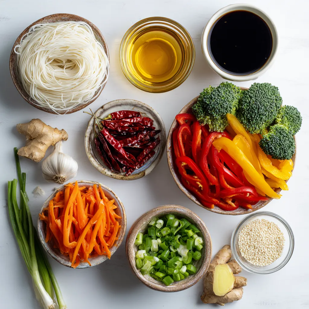 In this dish, rice noodles serve as the base. They soak up all the flavors well. Using vegetable oil allows the garlic and ginger to shine. Fresh garlic and ginger add a warm, spicy note. Red chilies bring heat, and you can adjust them for your taste. Soy sauce and chili paste provide salty and spicy depth. Finally, mixed vegetables add color and nutrition.