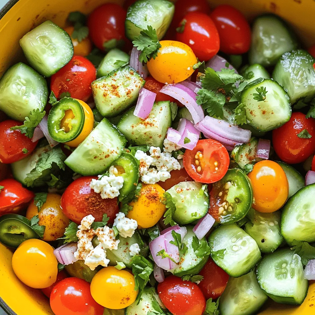 The main ingredients create a fresh and crunchy base. Cucumbers give a cool taste. Cherry tomatoes add sweetness. Red onion brings a sharp bite. Jalapeño adds heat, and cilantro gives a fresh finish.