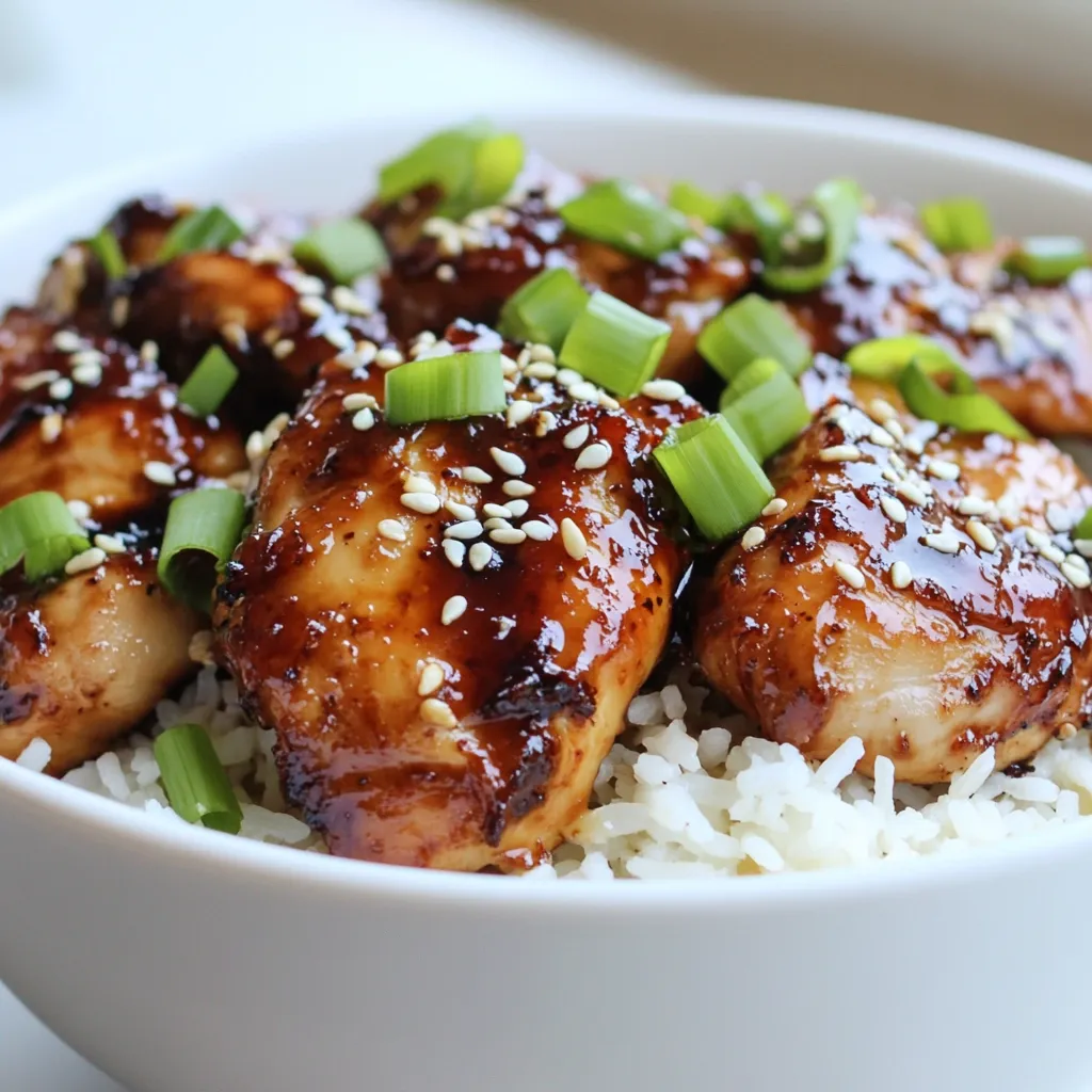A delicious and flavorful rice bowl featuring marinated chicken thighs and sticky sauce.