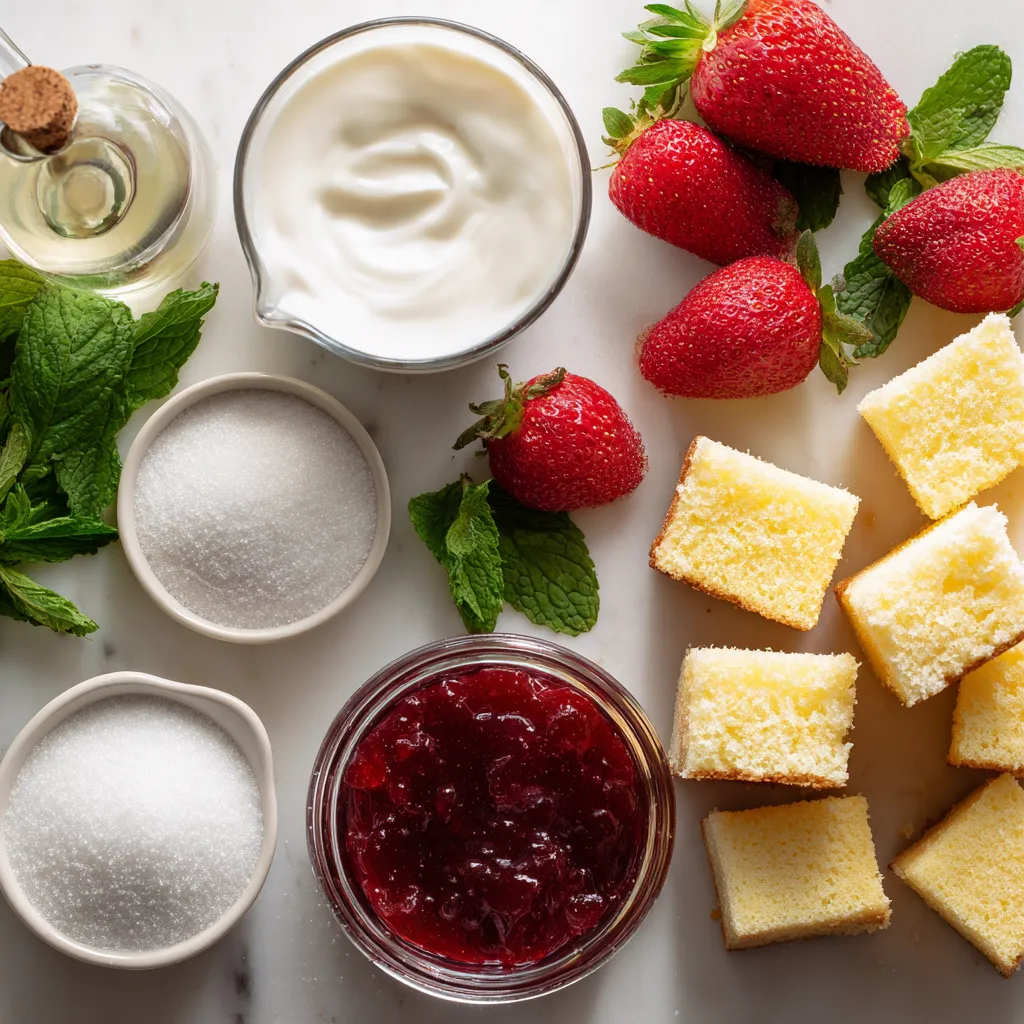 You will need 2 cups of pound cake cut into cubes. You can use store-bought or homemade pound cake. The cake gives a nice base to the trifle. You also need 1/2 cup of strawberry jam. It adds sweetness and flavor between layers. Lastly, fresh mint leaves make a beautiful garnish.
