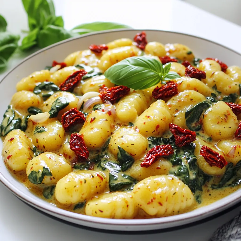 This simple list makes a tasty meal. The potato gnocchi acts as a soft base, while the sun-dried tomatoes add a rich, tangy flavor. Fresh spinach brings a burst of color and nutrients. Garlic and onion give the dish a warm aroma that fills your kitchen.