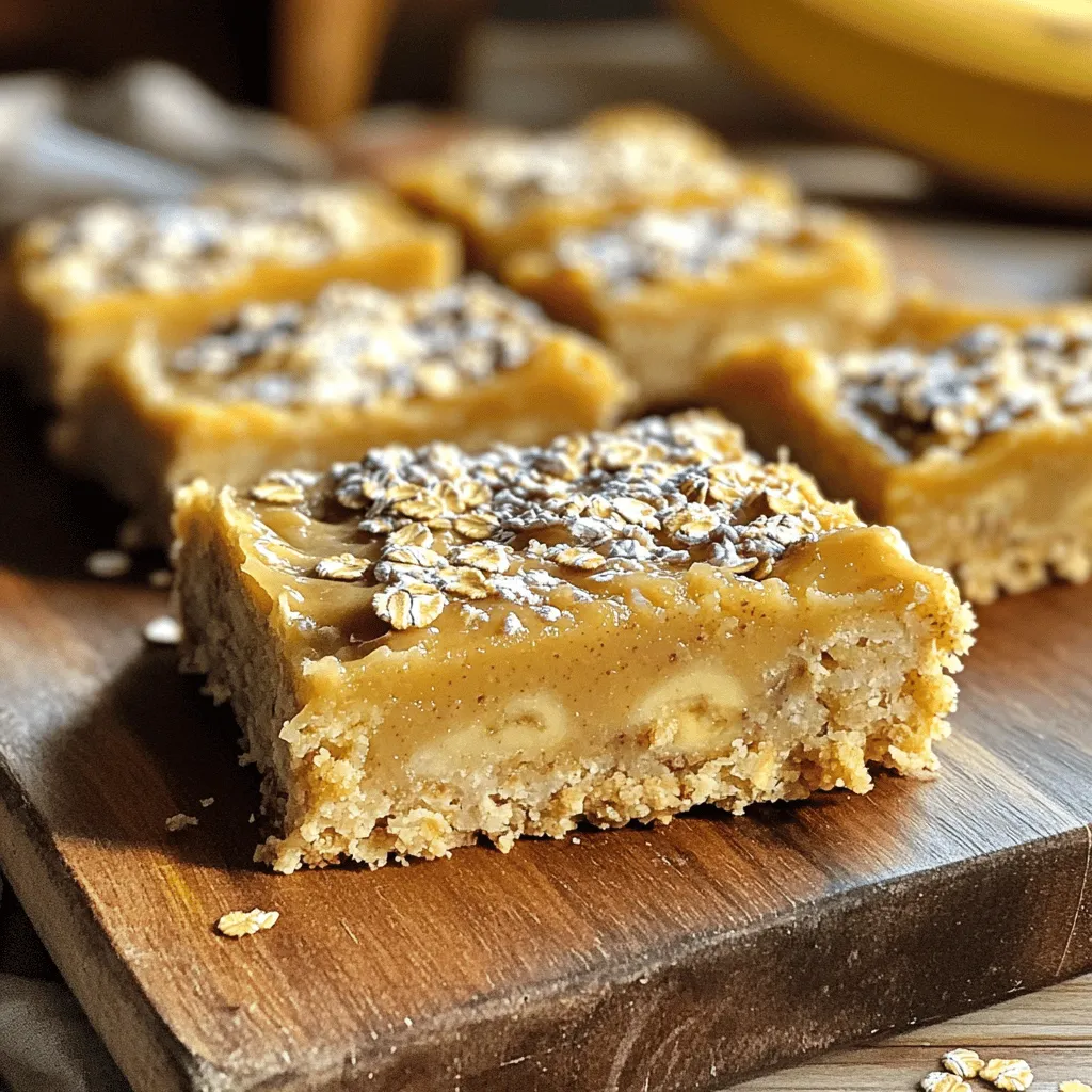 - 2 ripe bananas - 1 cup rolled oats - 1/4 cup almond butter (or nut butter of choice) - Chopped nuts - Dried fruit - Chocolate chips First, preheat your oven to 350°F (175°C). This helps the bars bake evenly. Next, take your two ripe bananas and mash them in a mixing bowl. Use a fork to get them smooth and creamy. This is your base. Now, add the rolled oats and almond butter to the mashed bananas. Mix everything well. You want it to be thick and combined. This mixture is what makes the bars tasty and healthy. Pour the mixture into a prepared baking pan. Spread it evenly with a spatula. Bake for 20-25 minutes until the edges turn golden brown. This gives them a nice texture and flavor. When they are done, let them cool before cutting. How to choose ripe bananas: Select bananas that are yellow with a few brown spots. These spots show they are sweet and ready. Avoid green ones, as they are not sweet yet. The right ripeness makes your bars taste great. Ensuring the right consistency: When you mash the bananas, make sure they are smooth. No lumps should remain. This helps mix well with oats and nut butter. The mixture should be thick, not runny. If it feels too dry, add a splash of water or milk. Best served warm or chilled: You can enjoy these bars warm, straight from the oven. They also taste nice when cooled. Either way, they make a great snack or breakfast. Toppings or spreads to pair with: Top the bars with yogurt or fresh fruit for added flavor. You can also spread more nut butter on top. Honey or maple syrup adds a sweet touch, too. To keep your banana oat bars fresh, store them in an airtight container. This helps keep moisture out and preserves flavor. If you want to store them longer, the freezer is your best friend. Just wrap them tightly in plastic wrap and place them in a freezer bag. This way, they last much longer without losing taste. These banana oat bars typically last about five days in the fridge. If they are frozen, they can last up to three months. You can tell they are spoiled if you see mold or notice an off smell. Always check before you enjoy your snack! Each bar has around 100 calories. They are rich in fiber, which helps digestion, and protein, good for muscle health. The almond butter adds healthy fats that keep you full longer. Oats and bananas are both great for your health. Oats help lower cholesterol and improve heart health. Bananas provide potassium, which is good for your muscles and heart. These bars make a smart snack choice, offering energy without added sugar. {{image_2}} Can I substitute ingredients? Yes, you can substitute ingredients in many ways. You can switch almond butter for peanut butter or sunbutter. You can also replace rolled oats with quick oats. These swaps still keep the bars tasty and healthy! How to make these bars gluten-free? To make these bars gluten-free, use certified gluten-free rolled oats. Most oats are safe, but some may have gluten. Always check labels to be sure. Recommended portion sizes for snacks I recommend cutting the bars into 12 squares. Each square makes a perfect snack. You can also cut them smaller for bite-sized treats. Can I double the recipe? Yes, you can easily double the recipe. Just use a larger baking pan. A 9x13-inch pan works well for double batches. Keep the baking time similar, but check for doneness. What to do if the bars don't hold together? If your bars fall apart, try adding more nut butter. You can also mash the bananas more. This helps create a stickier mixture that holds better. Adjustments for high-altitude baking At high altitudes, you may need to add a little more liquid. Try adding an extra tablespoon of almond butter. You might also bake for a bit longer if needed. In this blog post, I shared how to make tasty banana oat bars. You need just three main ingredients: ripe bananas, rolled oats, and almond butter. Optional add-ins can make your bars even better. Remember to preheat your oven and mix ingredients well for the best results. These bars are easy to store and are a healthy snack choice. With simple variations, you can customize them to suit your taste. Enjoy making and eating your banana oat bars!