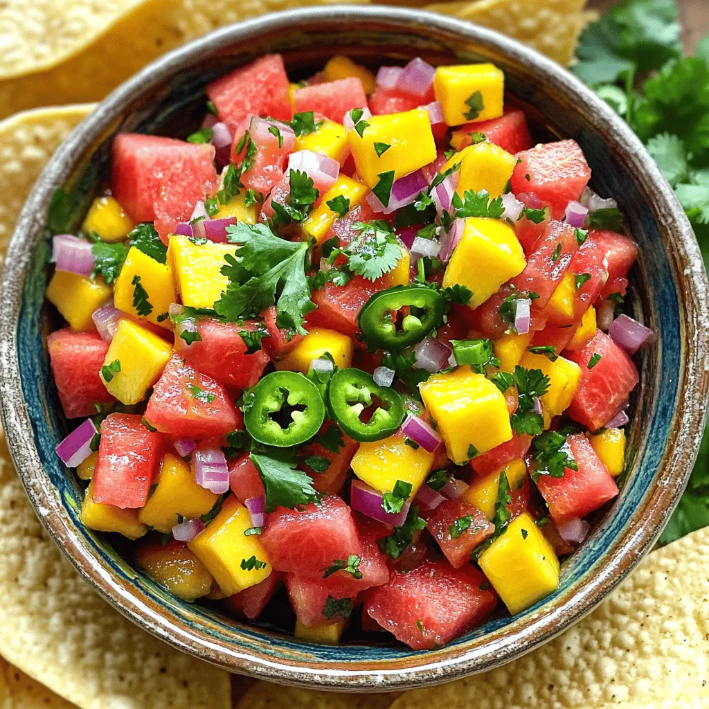 To achieve balanced flavors, use fresh ingredients. Fresh watermelon and mango give a sweet taste. The lime juice and cilantro add brightness. If you like a spicy kick, add jalapeño but start small.